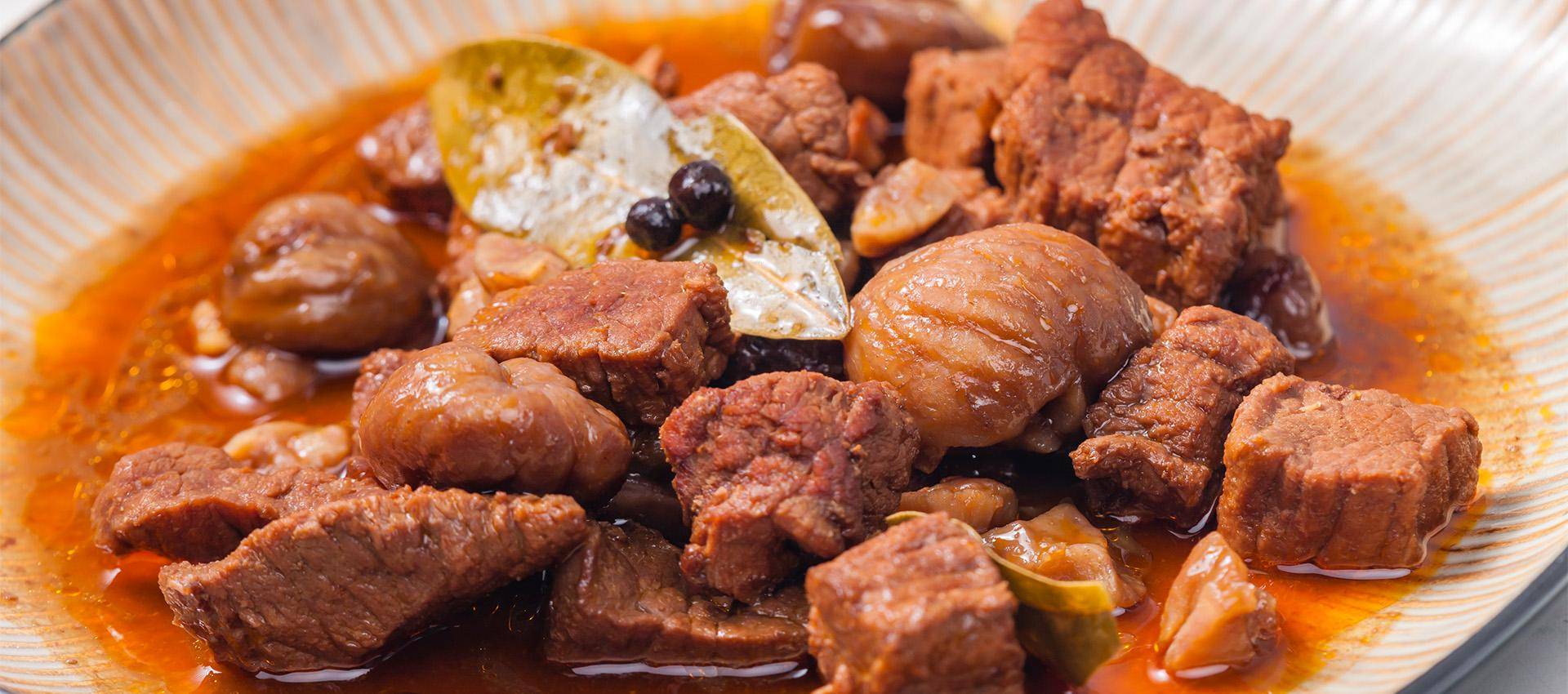das Fleisch wird nun mit dem Rinderfond und der Marinade abgelöscht. Den Essig beimengen und mit geschlossenem Deckel eine Stunde köcheln lassen.