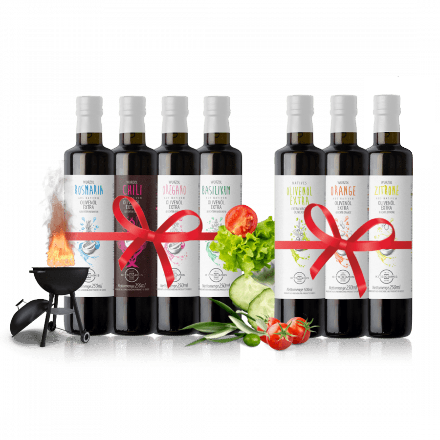 Damit Sie den Sommer so richtig genießen können, haben wir eine Sommer-Edition für Sie zusammengestellt. Mit unserem BBQ und Salat Set sind Sie für den nächsten Grillabend perfekt vorbereitet und für jeden Geschmack ist etwas dabei. Natives Olivenöl Extra und unsere wunderbaren Würzöle Chili, Oregano, Basilikum, Rosmarin, Orange und Zitrone. Das Besondere an unseren Ölen? Gewürze oder Früchte werden bereits während des Kaltextraktionsvorganges des Nativen Olivenöl Extra mit verarbeitet und Sie schmecken diese Geschmacksexplosion in jedem Würzöl.